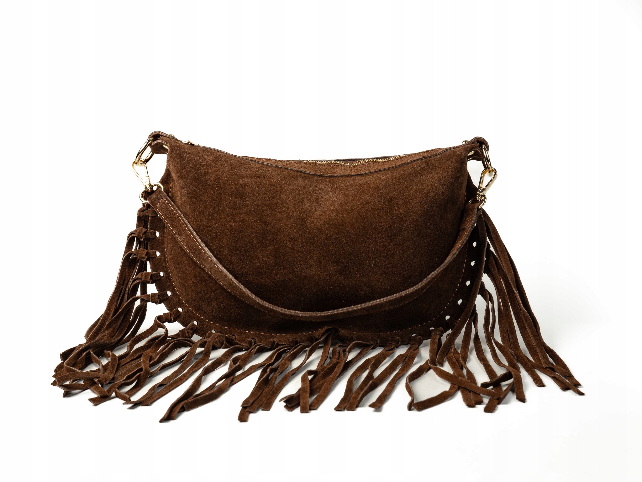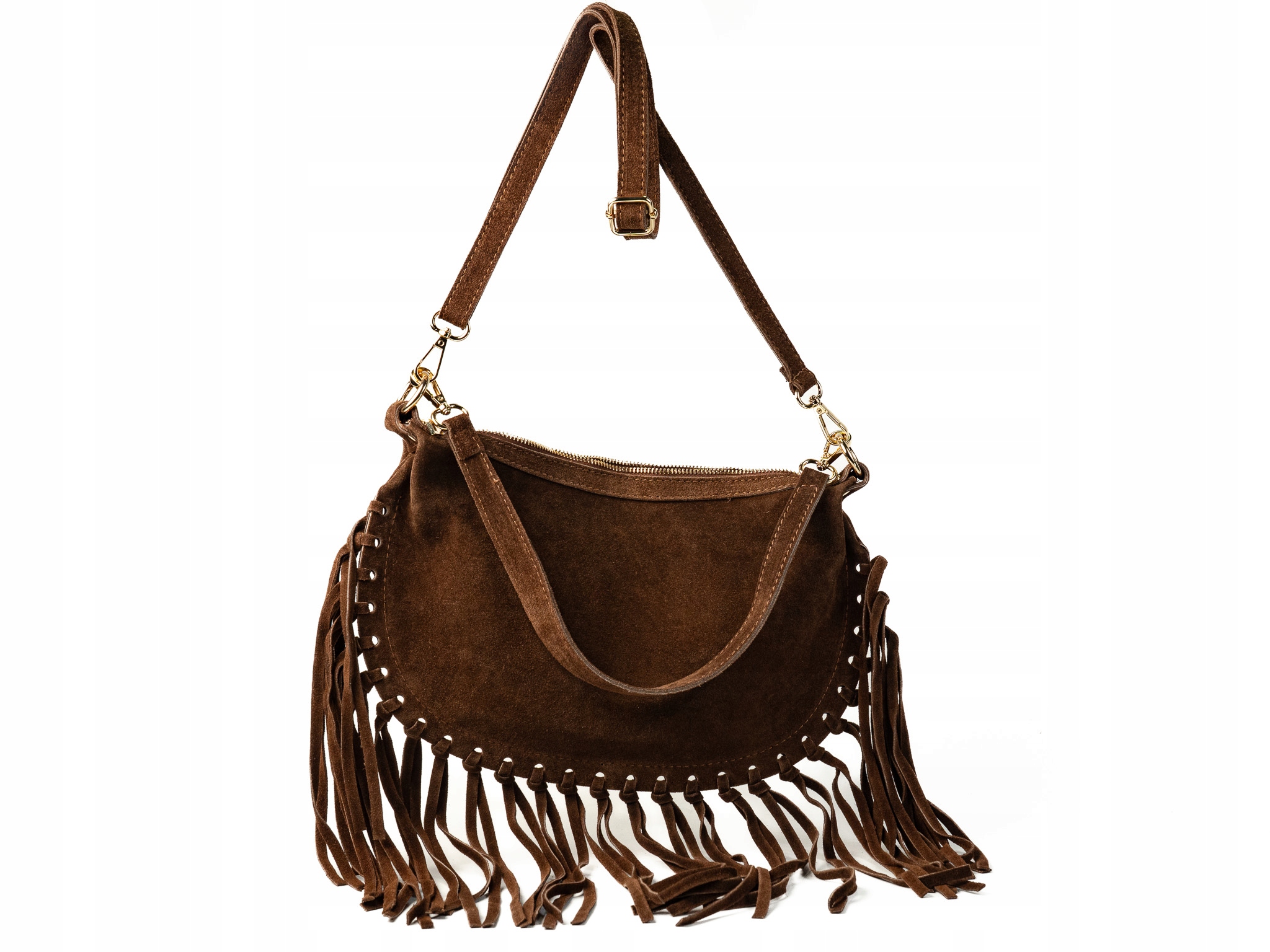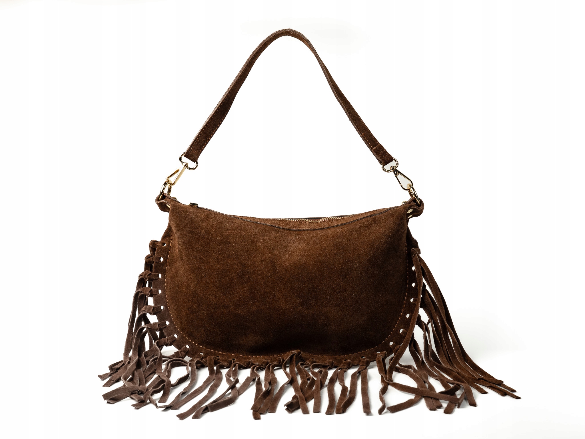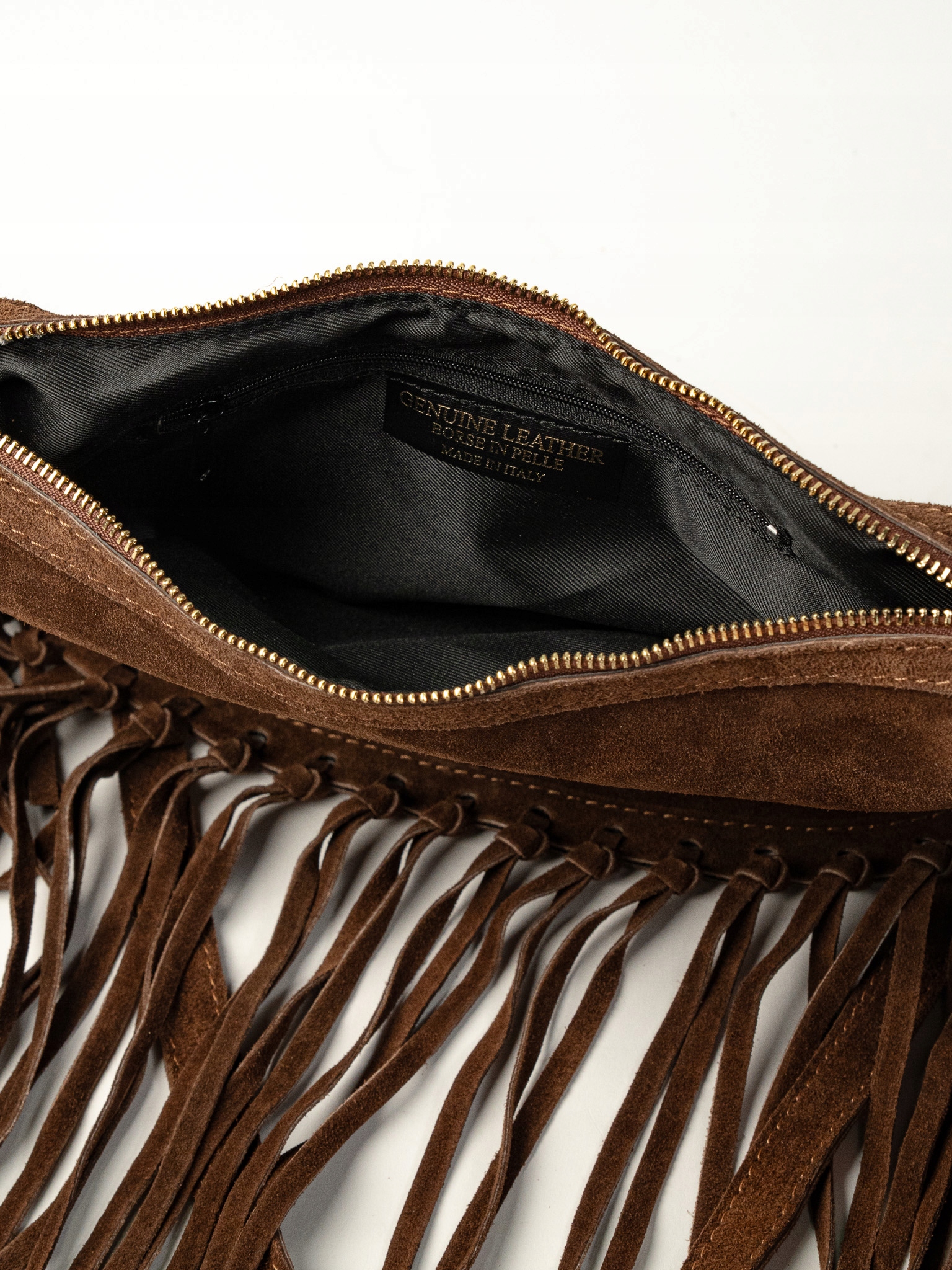 Torebka damska Bergamo wykonana z wysokiej jakości zamszu, w minimalistycznym stylu z ozdobnymi frędzlami. Posiada pasek do noszenia na ramieniu, jedną główną komorę oraz małą kieszonkę wewnątrz zapinaną na zamek. Lekka, wygodna i idealna na codzienne wyjścia.
