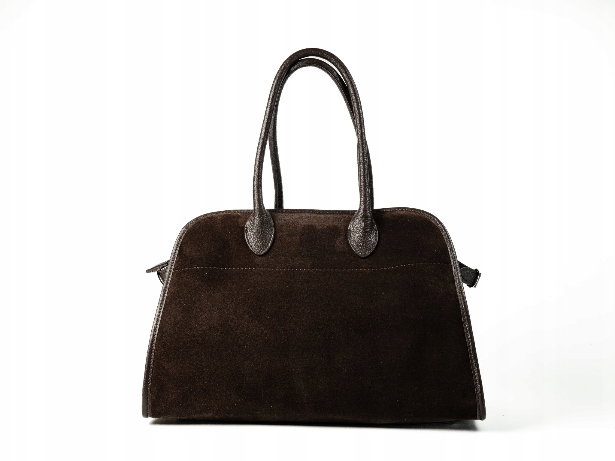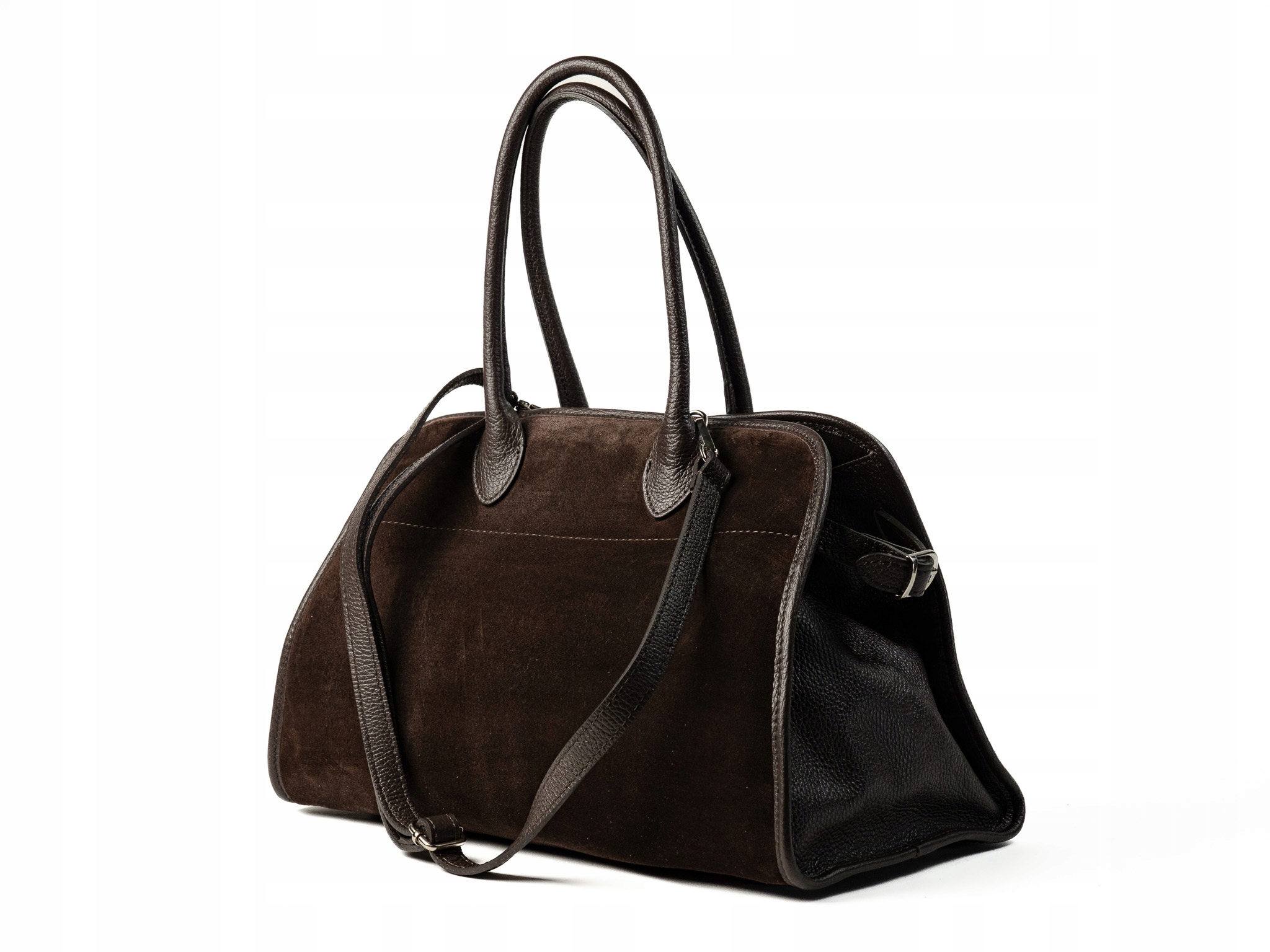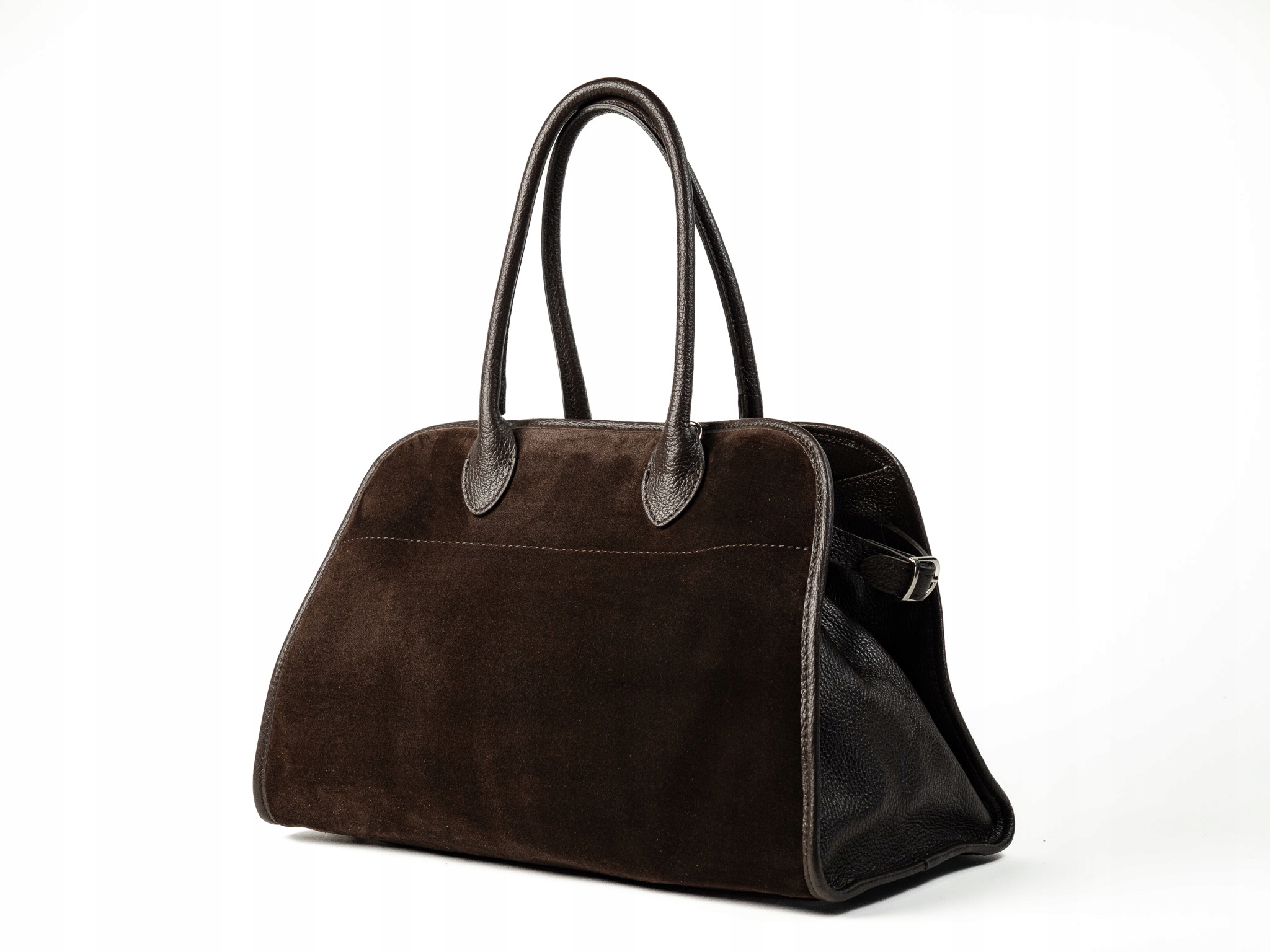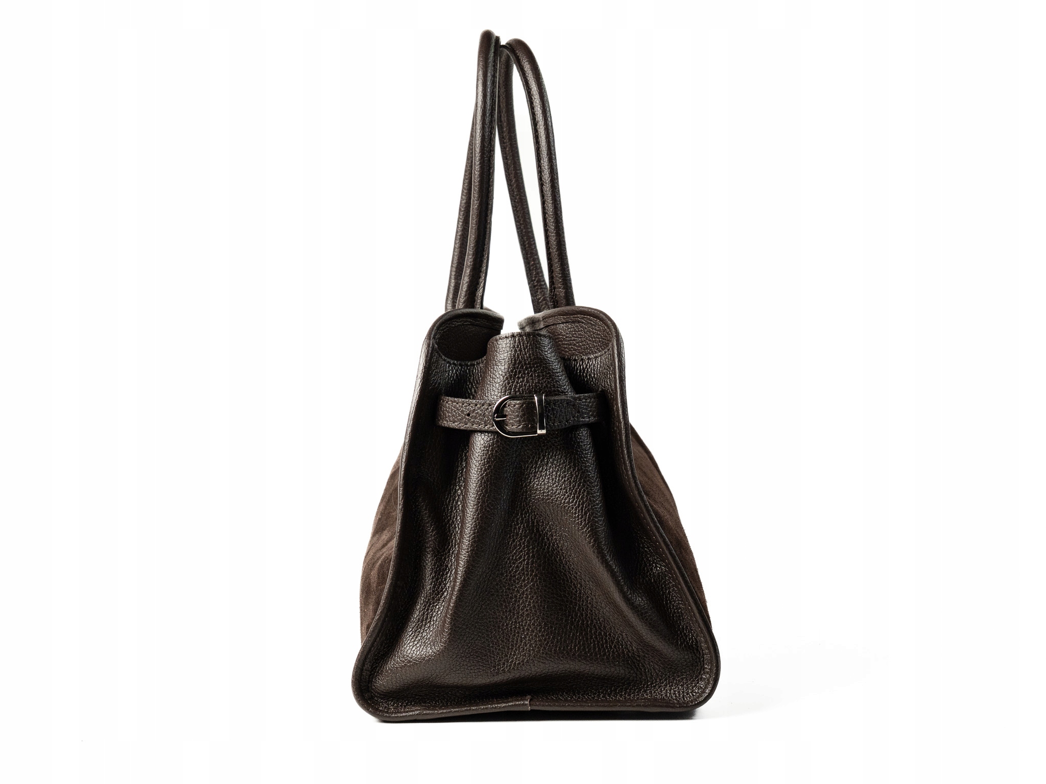 Torebka damska Napoli wykonana z wysokiej jakości zamszu, z bokami i dnem wykonanymi z naturalnej skóry. Przestronna i pojemna, idealna do noszenia laptopa i codziennych niezbędnych rzeczy. Posiada jedną główną komorę, dwie wygodne uchwyty do noszenia w dłoni oraz odpinany, regulowany pasek na ramię.