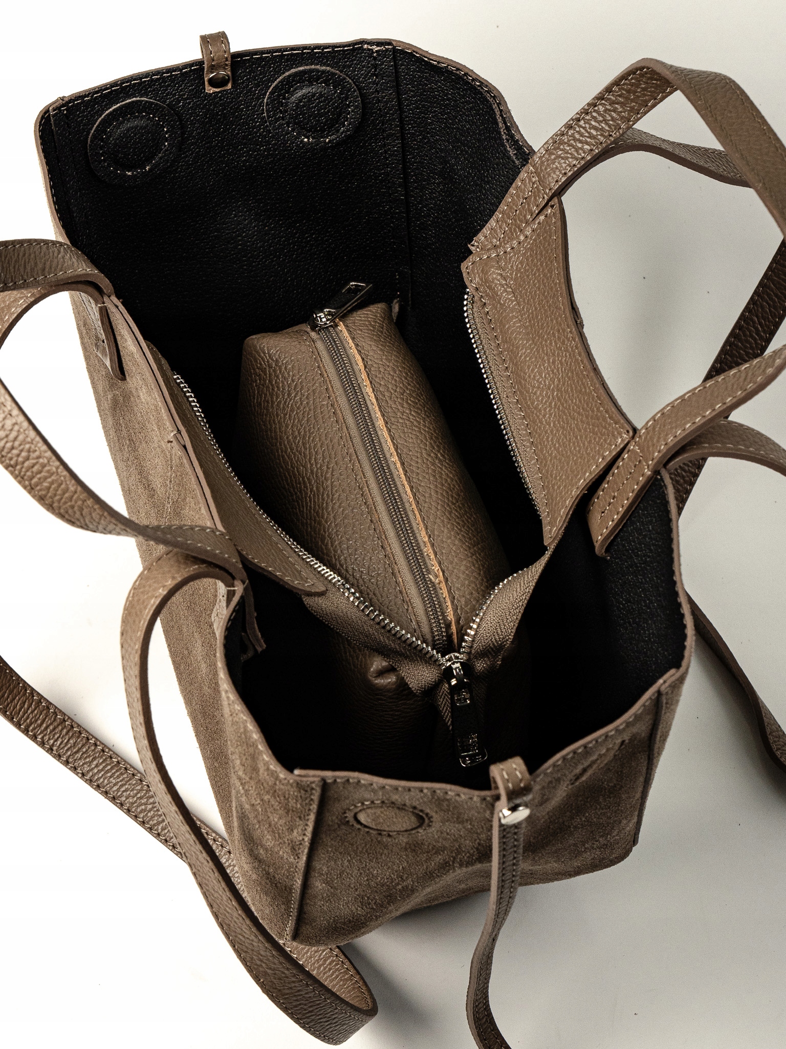 Torebka damska shopper Celia wykonana z wysokiej jakości włoskiego zamszu. Posiada jedną dużą główną komorę oraz wewnętrzną saszetkę. Zapięcie na magnesy umożliwia wygodne użytkowanie. Wyposażona w krótkie i długie uchwyty, idealna do noszenia na ramieniu jako shopper. Elegancka, funkcjonalna i wykonana z wysokiej jakości materiałów.