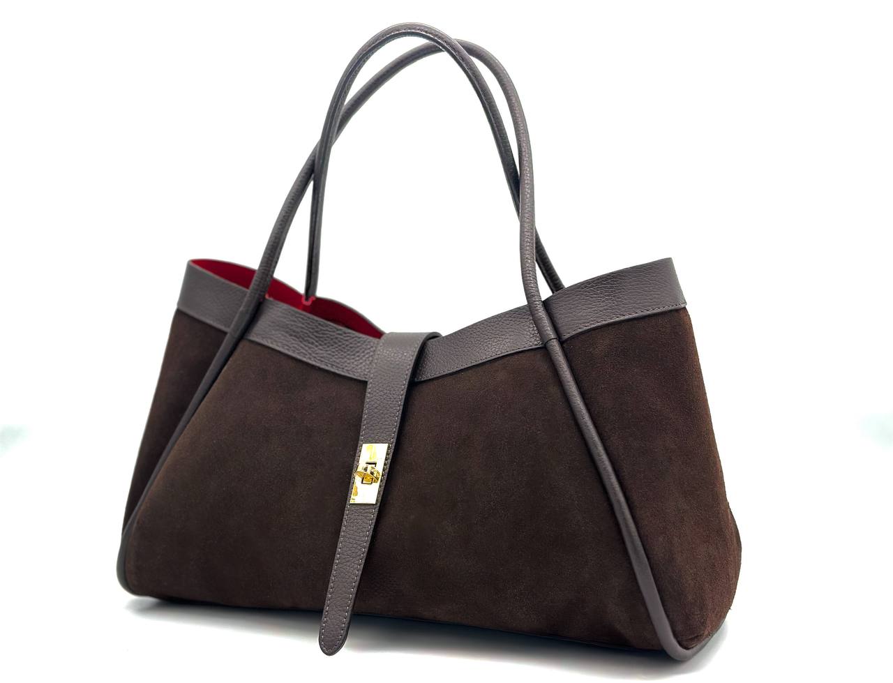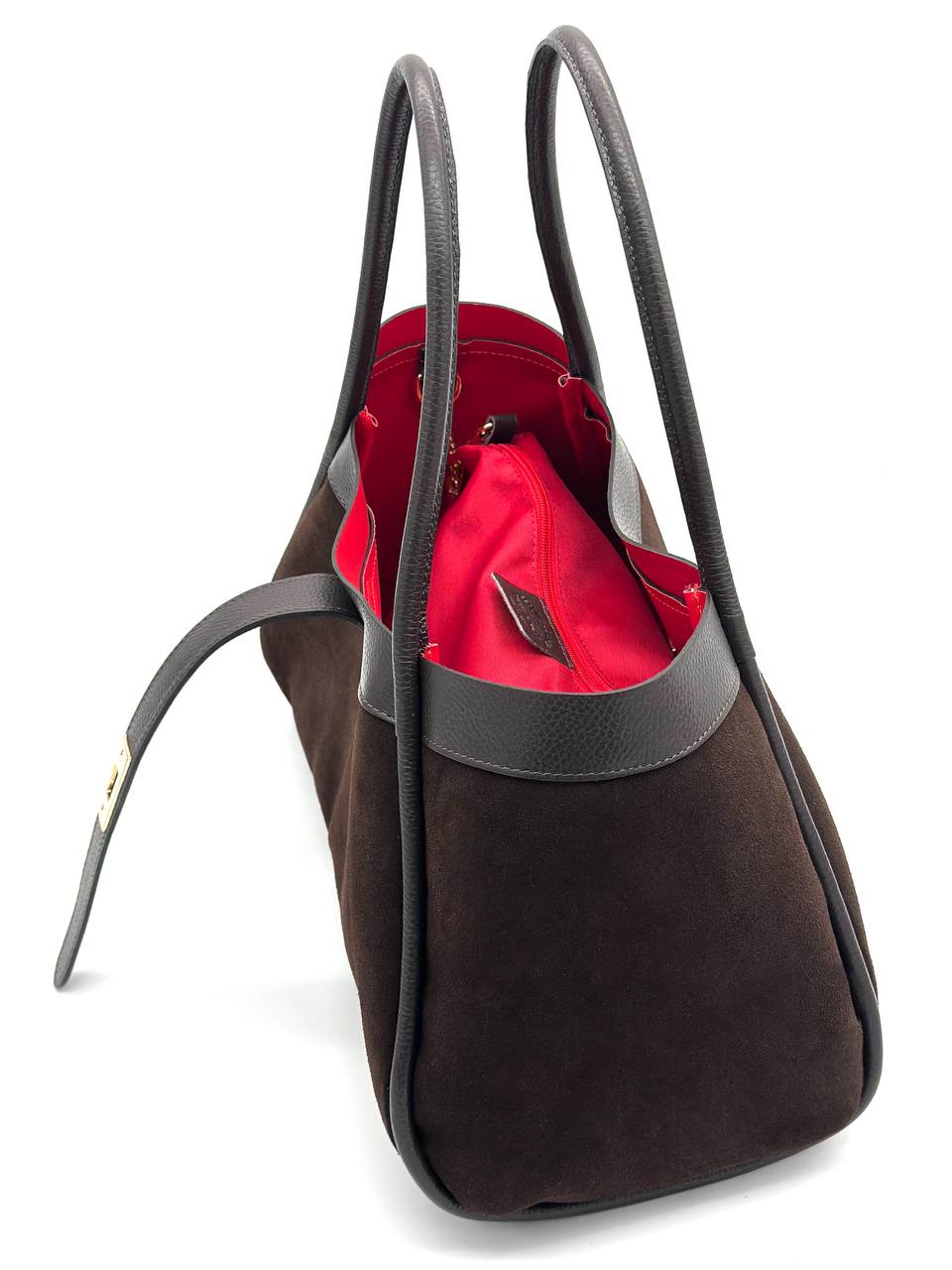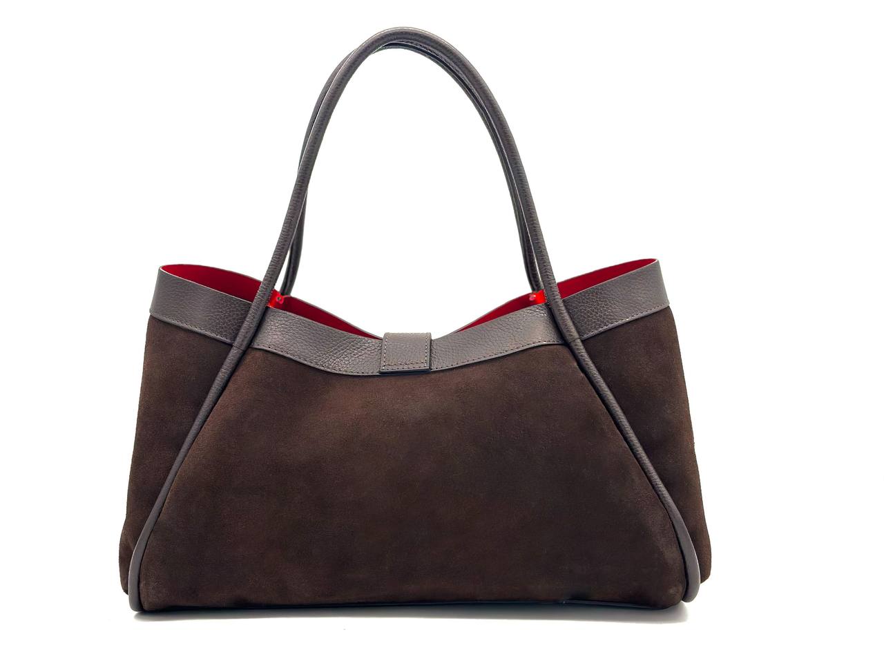Torebka damska Fiore wykonana z wysokiej jakości włoskiego zamszu. Duża, klasyczna torba w formacie A4, elegancka i stylowa. Wnętrze w czerwonym kolorze, wyposażone w czerwoną saszetkę oraz złotą klamrę. Posiada odpinany, regulowany pasek, idealna do pracy i na codzienne wyjścia.