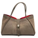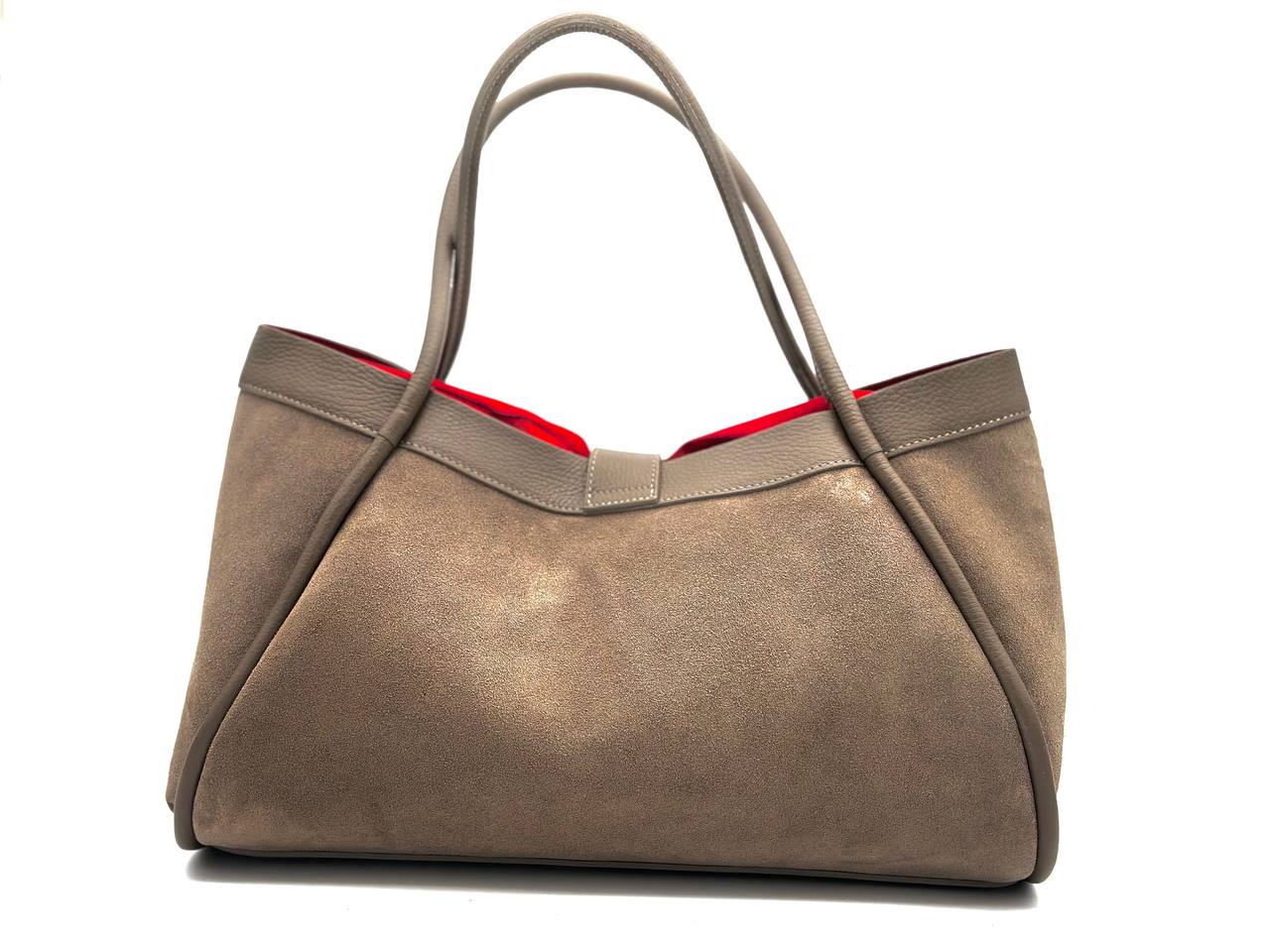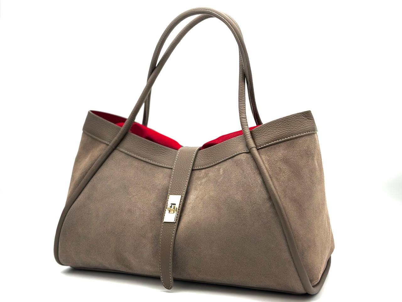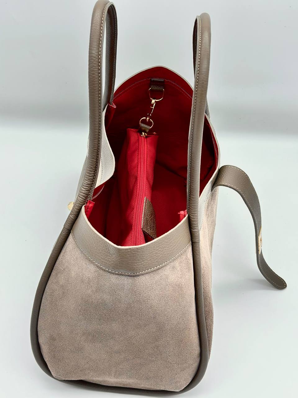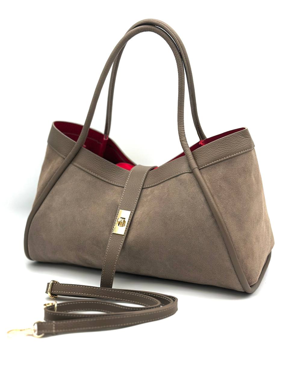Torebka damska Fiore wykonana z wysokiej jakości włoskiego zamszu. Duża, klasyczna torba w formacie A4, elegancka i stylowa. Wnętrze w czerwonym kolorze, wyposażone w czerwoną saszetkę oraz złotą klamrę. Posiada odpinany, regulowany pasek, idealna do pracy i na codzienne wyjścia.